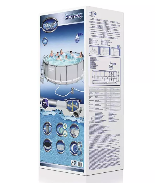 Каркасний басейн Bestway 56444-зроблений із застосуванням інноваційних технологій Ritech і PowerSteel, він стійкий до корозії, до тиску води і зносу. Полотно басейну з мозаїчним малюнком. Товщина стінок 0.60-0.90 мм. ПВХ преміального класу з підвищеним захистом від механічного і UV впливу. 3х-шаровий підсилює пояс з ПВХ.