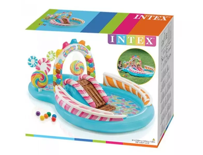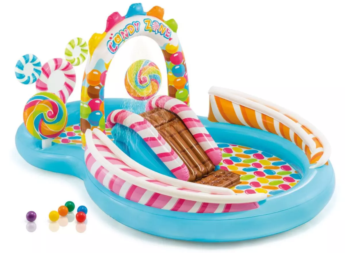 Ігровий центр Карамель 295х191х130см Intex 57149 складається з двох частин: великий басейн - 206 л і для самих маленьких - 168 л.При підключенні садового шланга зі стінок басейну б'ють пустотливі фонтанчики, що дарують радість малюкам, завзятий сміх, а також захищають від ультрафіолету. Для більшого веселощів передбачена гірка, завдяки якій діти можуть весело скочуватися з одного басейну в інший.Також центр включає в себе надувні льодяники. Одночасно в ньому можуть вміститися кілька дітей. Басейн дуже зручний при складанні, а малі габарити в складеному стані дозволяють завжди взяти з собою в будь-яку поїздку.