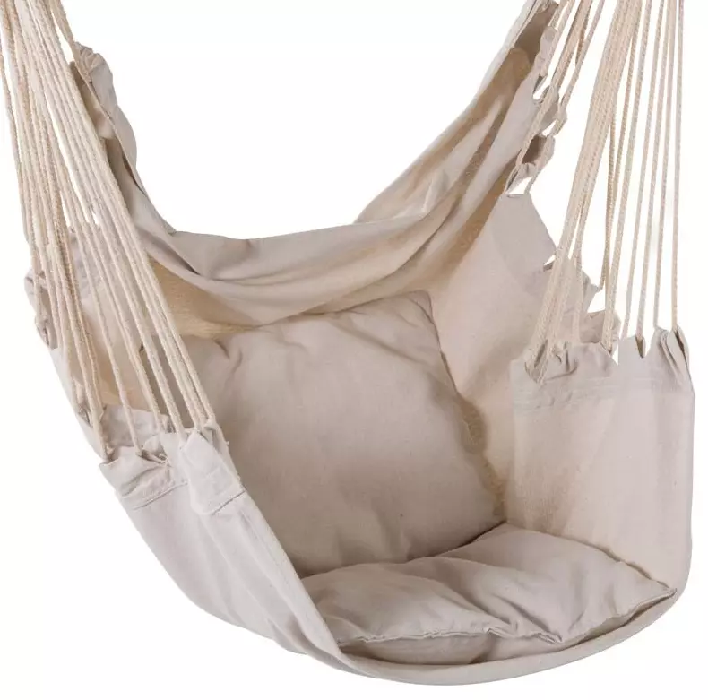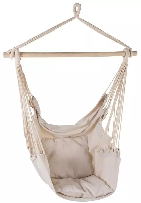 Сидячий гамак WorldSport 483В-1 бежевого кольору — комфортне рішення для відпочинку на природі або вдома. Виготовлений із бавовни та дерева, витримує до 130 кг. У комплекті — 2 м’які подушки. Зручний, надійний і стильний